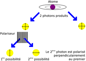 En effet, selon la mécanique quantique, avant la mesure, la polarisation de ces photons est indéterminée. Les photons sont dans un état juxtaposé entre les polarisations horizontale et verticale, c'est-à-dire qu'il y a une chance sur deux d'obtenir une polarisation horizontale lors de la mesure, et une chance sur deux d'obtenir une polarisation verticale.