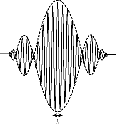 On peut représenter au premier abord les photons par des paquets d'onde : l'onde électromagnétique n'est pas une sinusoïde d'extension illimitée, il y a une enveloppe d'amplitude importante encadrée par d'autres enveloppes nettement moins significatives.