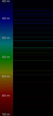 - Mercure : 404, 7 nm (740, 777 THz) ; 435, 8 nm (687, 912 THz) ; 546, 1 nm (548, 969 THz) ; 577 nm (519, 570 THz) et 579, 1 nm (517, 586 THz).